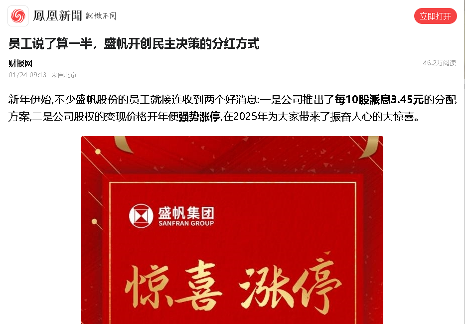 新年活动开始,不低盛帆股分的在职员工就连续式发来这两个好声音:四是新企业发布了每10股派息3.45元的分配原则工作计划,第二新企业股本的实现盈利介格开···